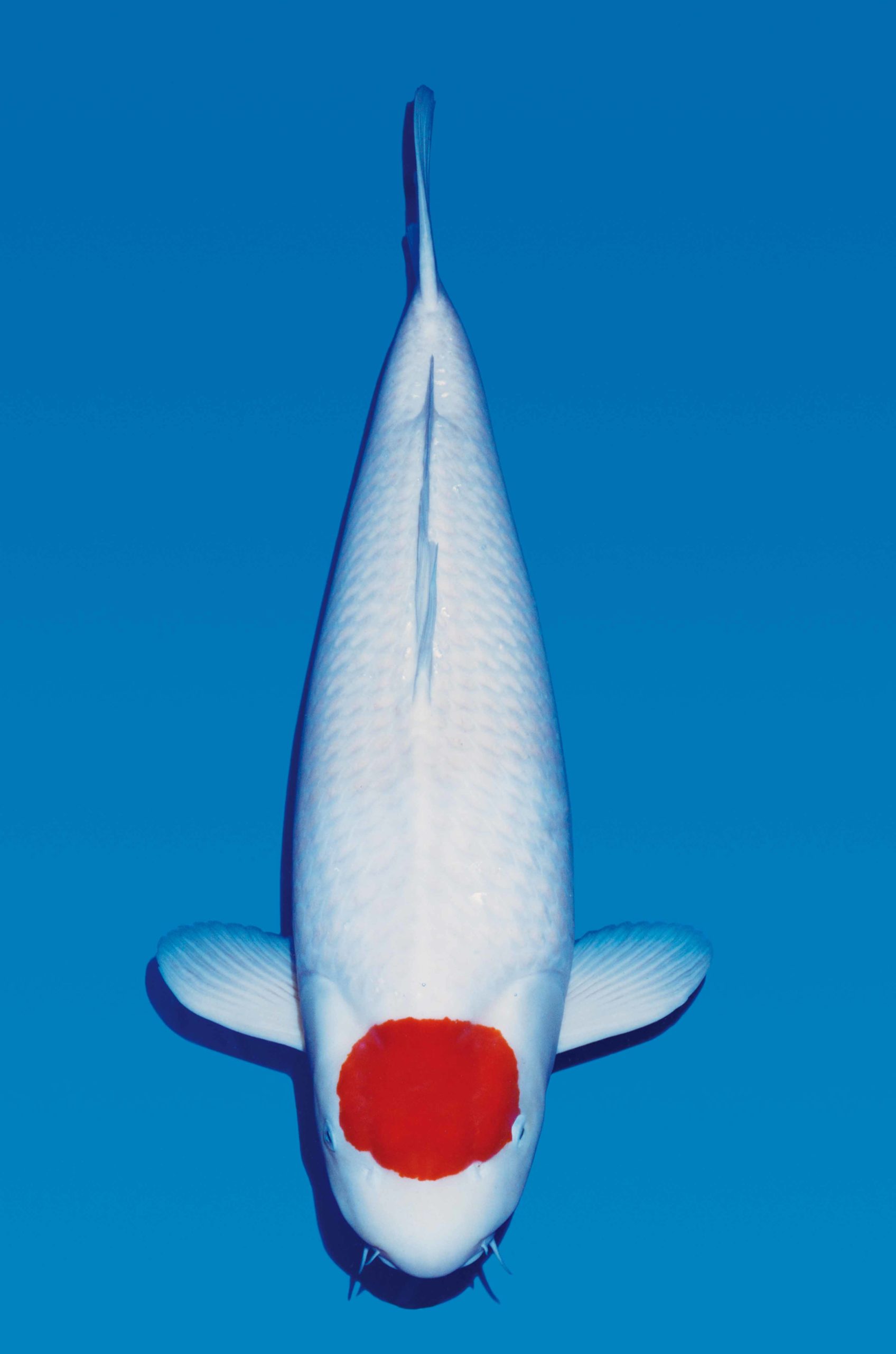 Tancho Kohaku, Tancho Showa, and Tancho Goshiki are gorgeous snowy white koi with a large Hi marking on their heads. The position of the Hi marking is very important and should be well proportioned on just the head.